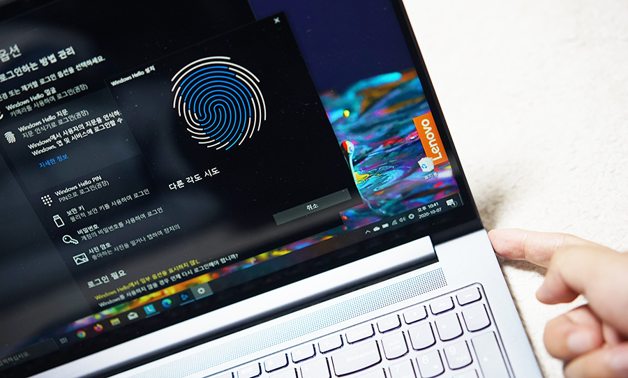 레노버 요가 슬림7은 오른쪽에 파워버튼이 있는데, 금속 버튼으로 아무 표시도 되어 있지 않은 미니멀한 디자인으로 자칫 메뉴얼을 읽지 않았다면 눈치채지 못할 수 있는데요. 파워버튼은 지문인식 센서가 탑재되어 있습니다. 그래서 손가락을 가져다 대면 바로 로그인을 할 수 있죠 ^^