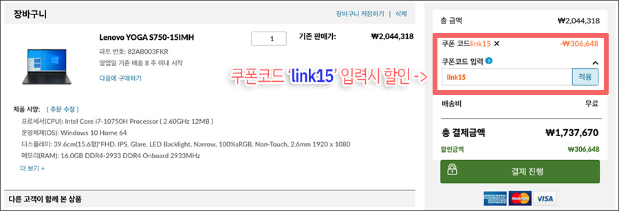 * 레노버 공홈에서 씽크패드, 요가, 리전, 아이디어패드 등의 제품 구입시, 쿠폰코드 'link15'을 모두 소문자로 입력하시면 추가할인을 받을 수 있습니다. :)