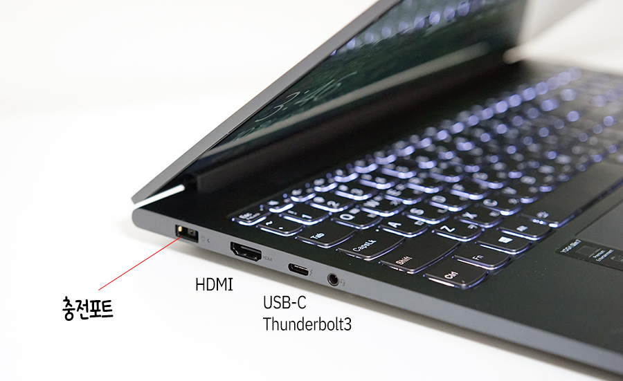 좌측에는 커다란 충전포트가 있는데요. 전용 충전기를 사용해서 고속충전이 가능합니다. HDMI는 HDMI 2.0b이며, USB-C 포트는 썬더볼트3, DP포트, 그리고 USB-PD 충전을 겸합니다. ^^ 3.5mm 오디오 잭도 있죠.