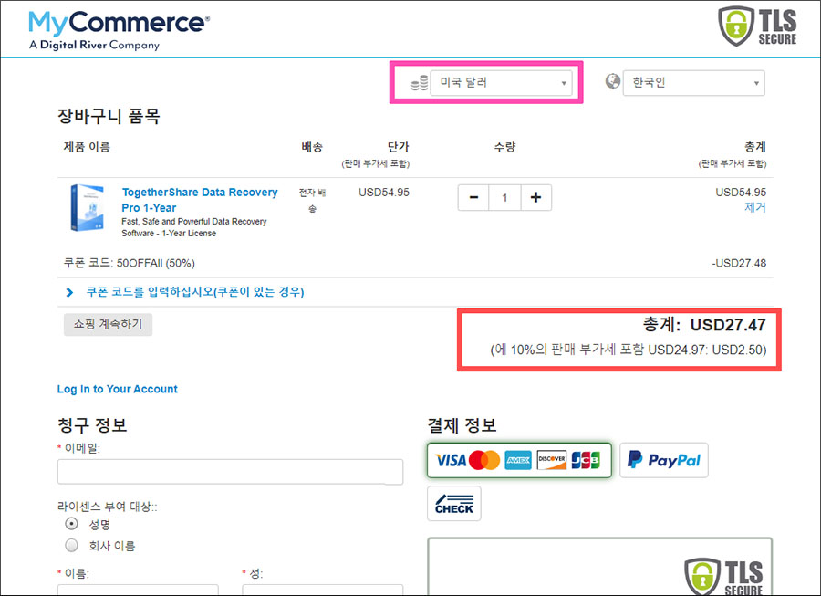 투게더쉐어 데이터 리커버리 소프트웨어를 구입하실 때는 자국 통화 결제(DCC)를 피하기 위해 USD (미국달러)로 결제하시면 됩니다. 요즘 달러화 환율이 떨어지고 있는 추세라서, 지금 구입하면 딱 좋은 데이터 전문 복구 소프트웨어네요. 이메일로 라이센스 코드를 부여받게 되니까 이메일 주소를 꼭 정확하게 입력하시구요.