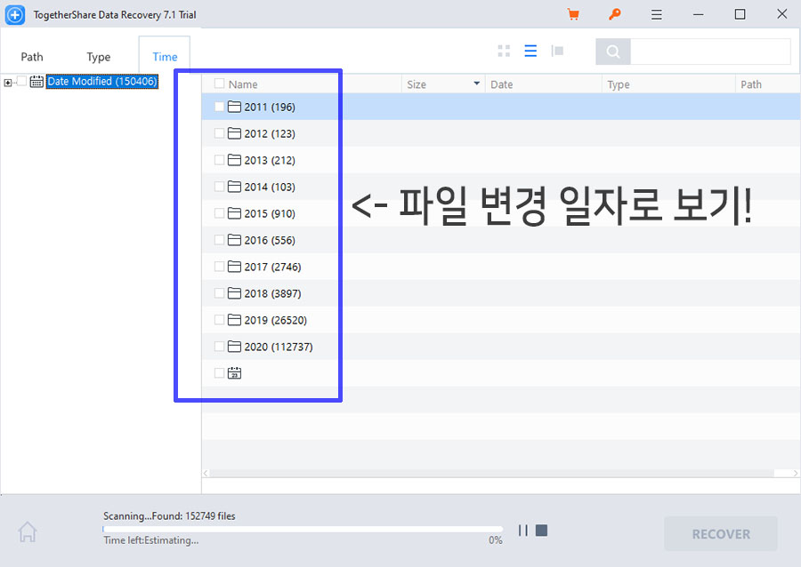 가장 마음에 들었던 기능은 Path 기준으로 찾는 기본 기능 이외에도 Type(파일형식)으로 사진이나 음악, 문서나 비디오 파일로 구분해서 지워진 파일을 탐색할 수 있다는 것과, Time (시간기준)으로 파일을 최종적으로 변경하여 저장할 날짜를 기준으로 복구 가능한 파일들을 찾는 기능입니다.