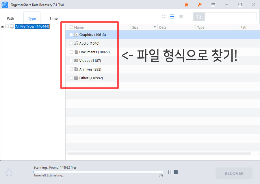 지워진 파일을 찾을 때 이런 구분이 없으면 힘들때가 많은데, TogetherShare Data Recovery 복구 앱은 이런 기본이 잘 되어 있네요.