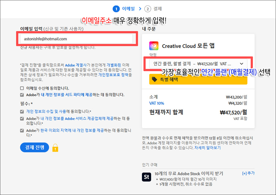 ๊ฒฐ์ ๋ฅผ ์๋ฃํ๋ค๋ฉด ์ ๋ ฅํ ์ด๋ฉ์ผID๋ก ์๋ด ๋ฉ์ผ์ด ์ค๊ณ , ์ด์ Adobe Creative Cloud ์ฑ์ ์ค์นํ ๋ค ๋ก๊ทธ์ธ ํด์ ํฌํ ์ต์ด๋ ํ๋ฆฌ๋ฏธ์ด ํ๋ก ๋ฑ์ ๋ค์ด๋ก๋ ์ค์นํด์ ์ฌ์ฉํ๋ฉด ๋ฉ๋๋ค. :)