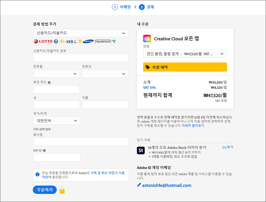์ด๋๋นCC๋ ์ด๋ฉ์ผ์ฃผ์ ID๋ก ๊ตฌ๋ ์ ํ๋ ๋ฐฉ์์ ๋๋ค. ๋ณดํต ๋ค์ด๋ฒ๋ ์ง๋ฉ์ผ ๊ณ์ ์ผ๋ก ์ฌ์ฉํ์๋ฉด ๋๋๋ฐ์. ์์ ์ด๋ฉ์ผ ์ ๋ ฅ ๋์ ์์ฃผ ์ฌ์ฉํ๋ ์ด๋ฉ์ผ ์ฃผ์๋ง ์ ๋ ฅํ๋ฉด ๋ฐ๋ก Adobe ID ์์ฑ์ด ๋ฉ๋๋ค.