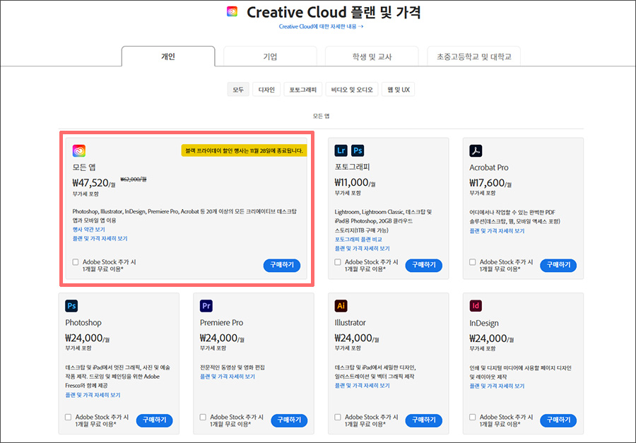์ด๋ฒ์ Adobe์์ ๋ธํ(๋ธ๋ํ๋ผ์ด๋ฐ์ด) ํ ์ธ์ ํ๊ธธ๋, ์ด๋๋น CC๋ฅผ ๋ชจ๋ ์ฑ์ ๊ตฌ๋ ํ๋ ๋ฐฉ๋ฒ์ ๊ฐ๋จํ๊ฒ ์ ๋ฆฌํด๋ด ๋๋ค. ์ด๋ฒ ํ ์ธ ๊ฐ๊ฒฉ์ด ๋๋ฌด ํ๊ฒฉ์ ์ด๋ผ์, ๊ตฌ๋ ๊ฐฑ์ ์ด ์กฐ๊ธ ๋จ์ผ์ ๋ถ๋ค์ ์๋ก ๊ตฌ๋ ํ์๋ ๊ฒ์ด ์คํ๋ ค ์ด๋์ผ ์ ๋ ์ ๋๋ค. ใ ใ