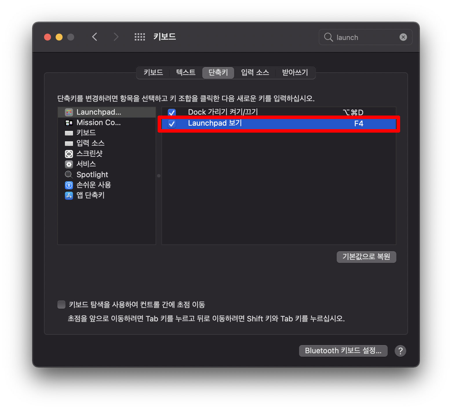 macOS Big Sur๋ก ๋์ด์ค๋ฉด์, ์ ์ผ์ธ์ง F4ํค์ ์์ด์ผ ํ๋ ๋ฐ์นํจ๋ ๋จ์ถํค๊ฐ ์คํฟ๋ผ์ดํธ๋ก ๋ณ๊ฒฝ๋์๋๋ฐ์. ์ ๊ฒฝ์ฐ์๋ ์ด๊ฑธ ๋ฐ๋ก์ก๊ธฐ ์ํด์ ์๋์ ๊ฐ์ด ๋จ์ถํค๋ฅผ ์กฐ๊ธ ์๋ณด๊ฒ ๋์์ต๋๋ค.