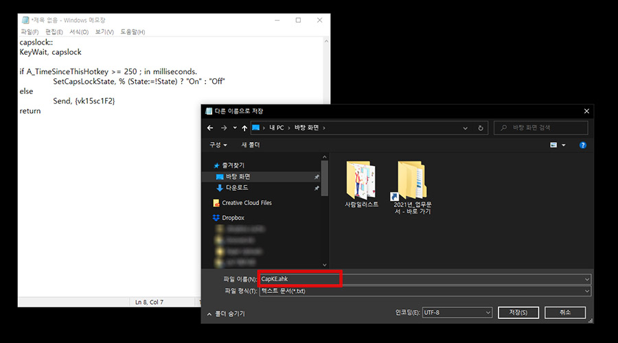 ์ค์น๋ฅผ ์๋ฃํ๊ณ ๋๋ฉด ์ง๊ธ๋ถํฐ ์ฐ์ธก ์ํธ(Alt)ํค ๋์ CapLocksํค๋ก ์ธ์ด์ ํ์ ํ ์ ์๋ ์คํฌ๋ฆฝํธ๋ฅผ ๋ง๋ค ๊ฑด๋ฐ์. ๋ฉ๋ชจ์ฅ์ ์๋์ ๋ด์ฉ์ ๋ณต๋ถํด์ ํ์ผ๋ก ์ ์ฅ์ ํ๋ฉด ๋๋๋ฐ, "CapKE.ahk" ์ ๋์ ๋ค์ด๋ฐ์ผ๋ก ์ ์ฅ์ ํด์ค๋๋ค. ์ฌ๊ธฐ์ ํต์ฌ์ .ahk ํ์ฅ์๋ก ๋ง๋ค์ด์ค์ผ ํ๋ค๋ ๊ฒ์ด์ฃ .