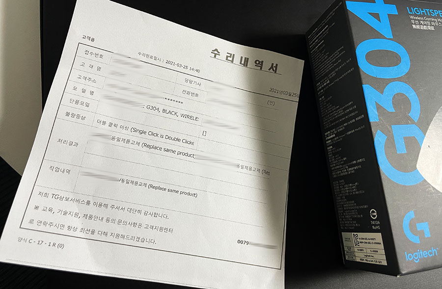 이전에 로지텍 G903 제품을 사용하다가 더블클릭, 드래그 플림 현상을 겪었기에, 이번에는 일부러(?) 로지텍 코리아 정품을 구입하였고, 사용한지 얼마되지 않아 스위치 고장이 발생했기에 직접 로지텍 코리아에 수리를 맡겨 보고자 검색을 시작했습니다.