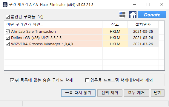 2021년 3월 기준으로 최신 버전은 HoaxEliminator5.03이며, 다운로드를 한 뒤에는 자신의 운영체제에 맞는 버전 (보통 64비트 윈도우를 쓰니 x64) 폴더안에 Hoax Eliminator 실행파일을 실행하면 됩니다. 그 다음부터는 그냥 안내에 따라 뭔지 알지도 못했던 보안 솔루션 프로그램들을 하나씩 제거해버릴 수 있습니다.