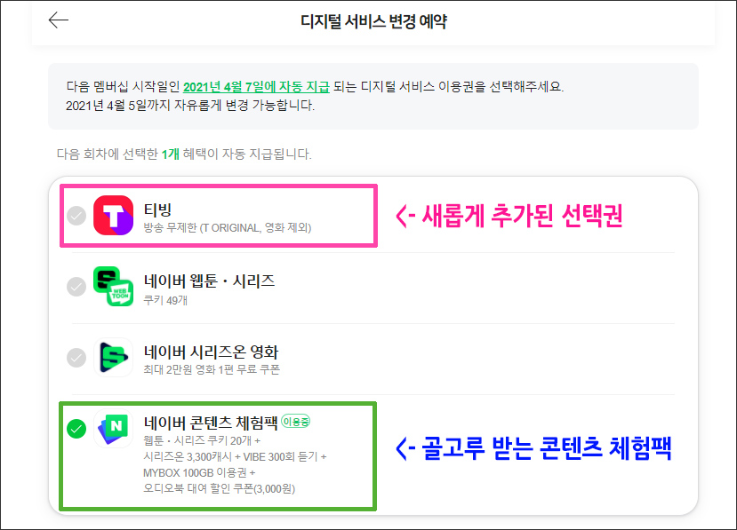 말씀드린 것처럼 티빙이 추가되었는데, 저는 티비 프로그램을 잘 안보는 편이라서 일단은 네이버 콘텐츠 체험팩에 머물러 있습니다. 티빙 컨텐츠를 자주 이용한다면 지금 관련 추첨 이벤트도 하는 것 같으니 티빙으로 네이버 플러스 멤버십 구독 서비스를 시작해보는 것도 의미가 있겠죠.
