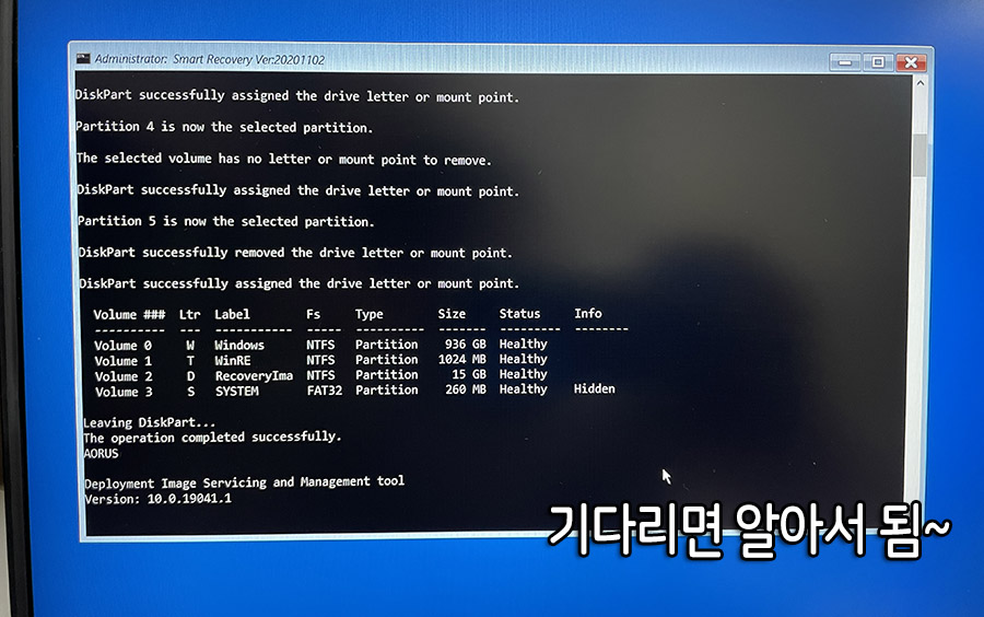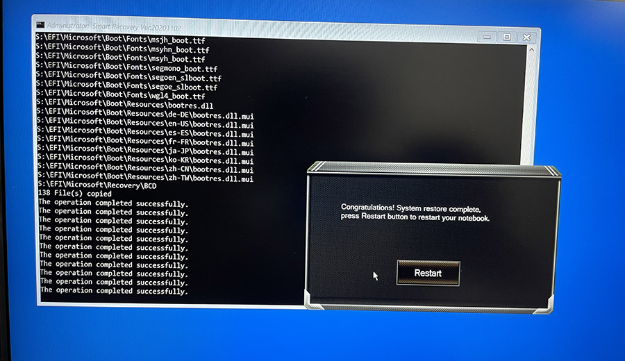 완료 되었습니다. Restart를 눌러 재부팅을 해보면, 처음 기가바이트 노트북을 구입했던 그 상태 그대로 돌아갔음을 알 수 있습니다. :)