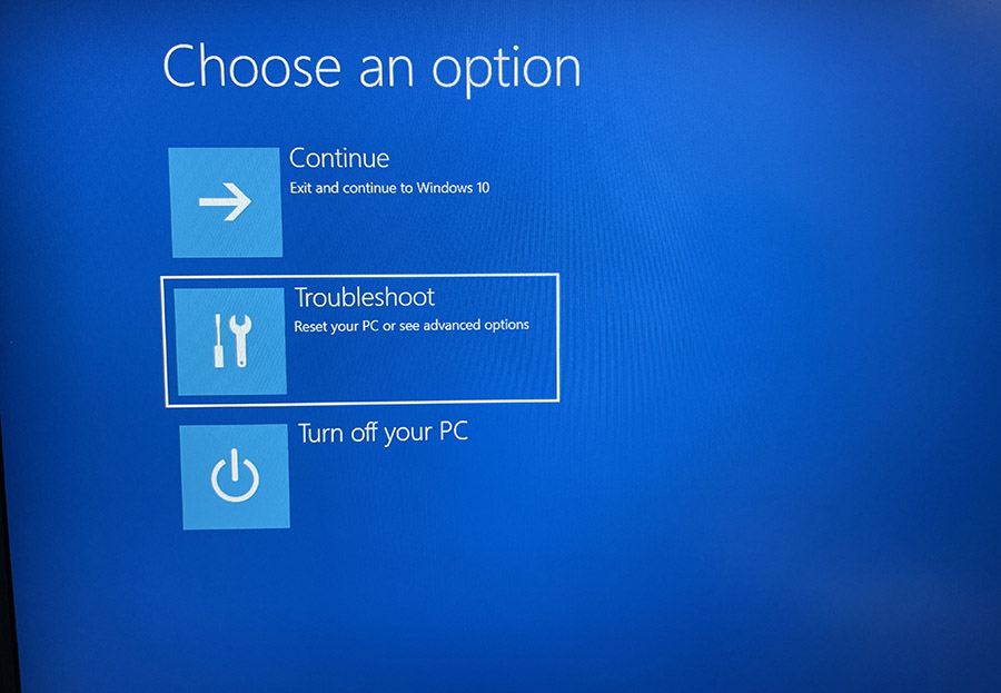 어찌보면 익숙하다고 할 수 있는 윈도우10의 안전모드 같은 화면이 뜹니다. 여기서 2번째 항목인 Troubleshoot를 선택해서 들어갑니다.