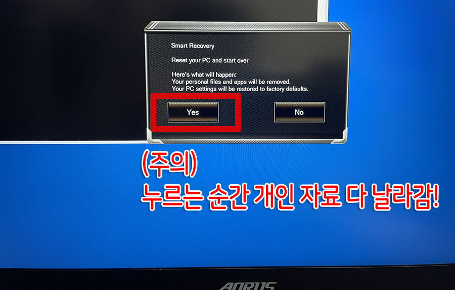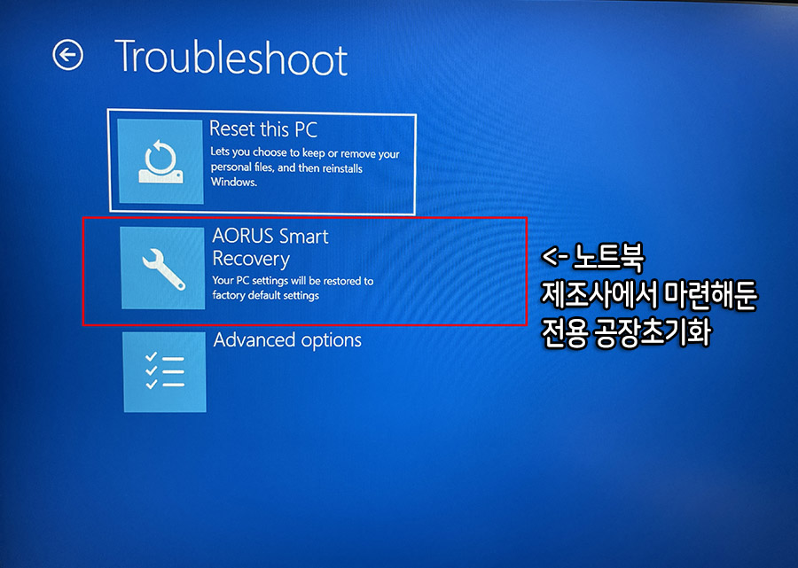 그러면 윈도우10의 자체 초기화 모드인 Reset This PC도 있지만, 제조사 기가바이트가 마련해둔 공장초기화 모드 (AURUS or AERO 등등 Smart Recovery)인 2번째 항목이 있죠.
