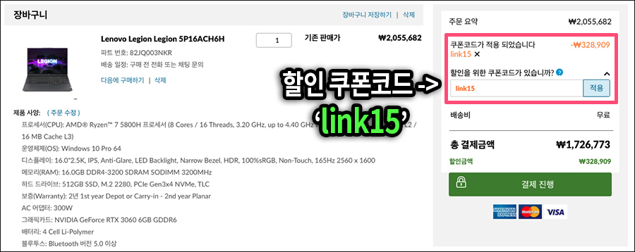 레노버 리전 게이밍 노트북 Legion 5 Pro 할인 쿠폰코드 'link15'