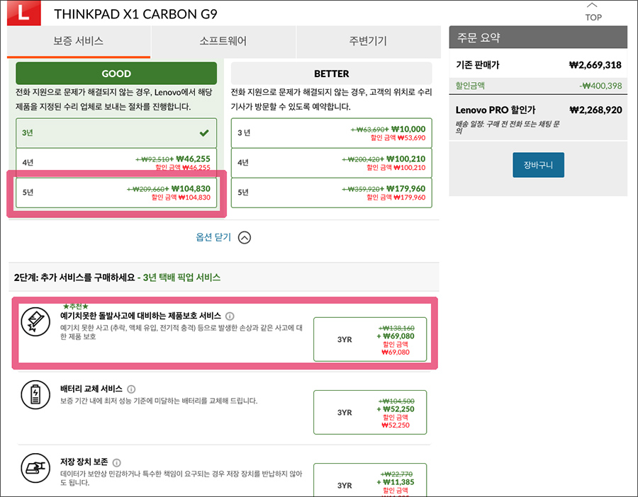 아 참, 요즘 노트북들은 구입하면 적어도 5~6년은 쓰기에 혹시라도 망가지면 AS를 걱정하게 되는데요. 그래서 저는 레노버 노트북을 구입할 때 보증옵션도 조금 업그레이드를 하는 편입니다. 지금은 이벤트 중이라 3년 무상보증이 제공되고 있는데요. 보통은 2년입니다.