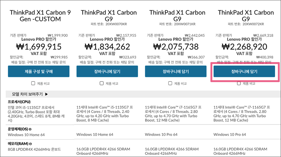 다 골랐다면, 장바구니 버튼을 클릭합니다. 참고로 Custom (CTO) 모델로 자신이 원하는 사양의 노트북을 주문할 수 있는 것도 레노버 공식 프로스토어의 특권이죠. CTO는 주문제작모델로 약 한달 정도 걸립니다만, 그래도 내 마음에 드는 노트북을 구입하는 것이기에 노트북에 대해서 뭘 좀 아시는 분들은 CTO 모델을 고르시는 걸 많이 봤습니다.