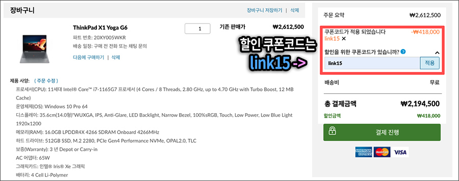 레노버 씽크패드 X1 요가 6세대 할인 쿠폰코드 'link15'