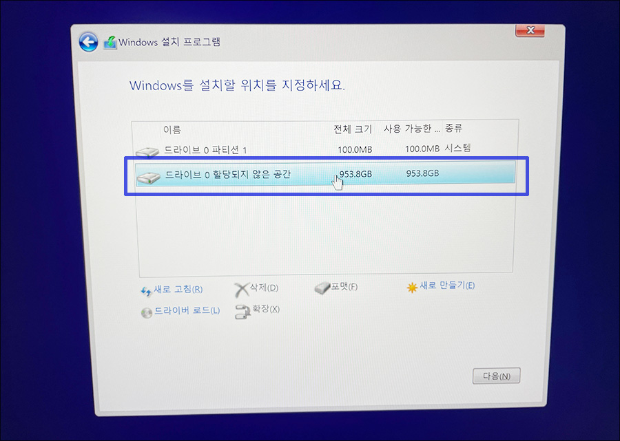 λ§μ½ νν°μ μ λ³΄κ° μ λ°μ΄νΈ λμ§ μμλ€λ©΄ 'μλ‘κ³ μΉ¨'μ λλ¬λ³΄λ©΄ λ©λλ€. λλΌμ΄λΈ 0μ νν°μ 1μ EFI (μμ€ν )μ΄ μ‘νμκ³ , ν λΉλμ§ μμ 곡κ°μ μ ννκ³ 'λ€μ'μ λλ₯΄λ©΄ μλμ°10 μ€μΉ νλ‘μΈμ€κ° μμμ ν¬λ§·μ νλ©΄μ μλμ°λ₯Ό μ€μΉν΄μ€λλ€.