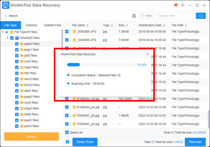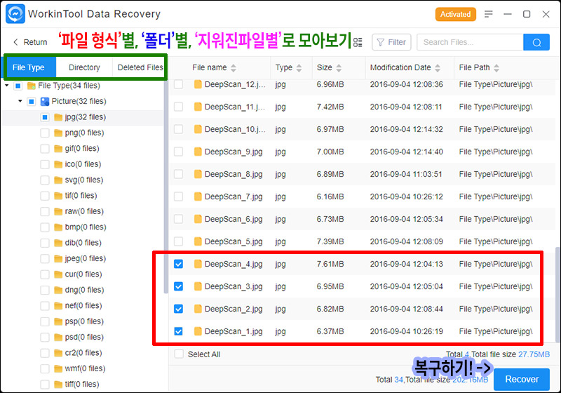 WorkinTool ๋ฐ์ดํฐ ๋ฆฌ์ปค๋ฒ๋ฆฌ ์ํํธ์จ์ด์ ๊ฒฝ์ฐ Quick Recovery ๋ณด๋ค๋ Deep Recovery์ ๋ณต๊ตฌ์จ์ด ๋งค์ฐ ํ์ํ๋๊ตฐ์. ์๊ฐ์ ์กฐ๊ธ ๊ฑธ๋ฆฌ๋ ํธ์ด์ง๋ง, ์ค์๋ก ์ง์ด ํ์ผ์ ์ ์ด๋ ค๋ด๊ธฐ ์ํด ์๊ฐ์ ๊ฐ๊ณ ๋ฅ ์ค์บ ๋ฆฌ์ปค๋ฒ๋ฆฌ๋ฅผ ์๋ํด๋ณด๋ ๊ฒ์ ๊ถ์ฅํฉ๋๋ค.