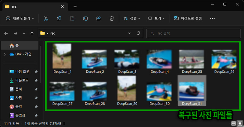 ์ด๋ฏธ์ง๋ ์ฌ์ง์ ๊ฒฝ์ฐ, ์ค๋ฅธ์ชฝ ๋ฏธ๋ฆฌ๋ณด๊ธฐ ์ฐฝ์ ๋ณด๋ฉด์ ์ํ๋ ์ฌ์ง์ ์ฐพ์ ์ ์์ต๋๋ค. ์ง์์ง ์ด๋ฏธ์ง๋ค ์ค, ๋ณต๊ตฌํ๊ณ ์ถ์ ์ฌ์ง์ ์ฐพ์๋ค๋ฉด ์ฒดํฌ๋ฐ์ค๋ก ์ ํํ ๋ค์ ์ฐ์ธก ์๋จ์ ์๋ 'Recover' ๋ฒํผ์ ๋๋ฅด๋ฉด ๋ค๋ฅธ ๋์คํฌ์ ์ ์ฅํ๋ ๋ฐฉ์์ผ๋ก ๋ณต๊ตฌ๊ฐ ๊ฐ๋ฅํฉ๋๋ค. D๋๋ผ์ด๋ธ ๊ฐ์ ๋ณ๋์ ํํฐ์ ์ด ์๋ ๊ฒฝ์ฐ๋ผ๋ฉด ์ธ์ฅํ๋๋ USB ๋ฉ๋ชจ๋ฆฌ ๋๋ผ์ด๋ธ๋ฅผ ๋จผ์ ์ค๋นํด๋๋ ๊ฒ์ด ์ข๊ฒ ์ฃ .