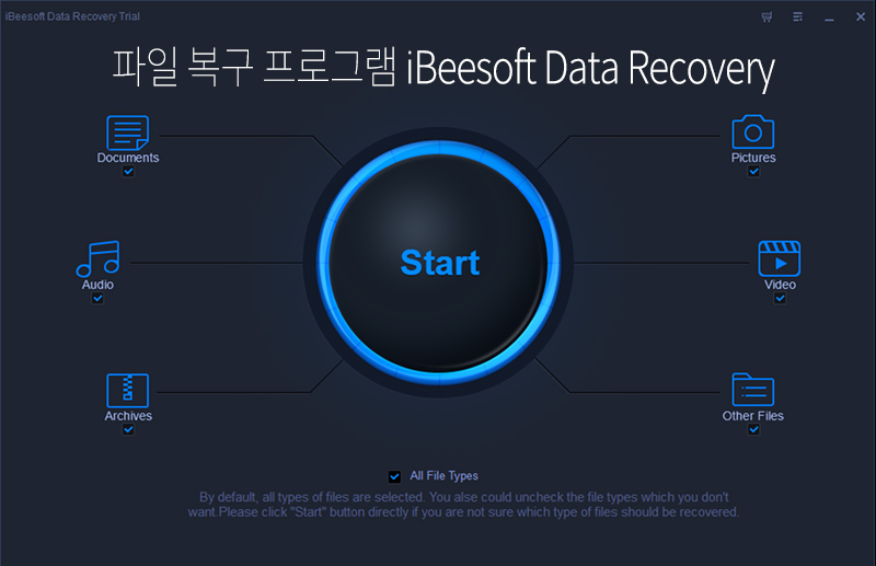 iBeesoft Data Recovery(์์ด๋น์ํํธ ๋ฐ์ดํฐ ๋ฆฌ์ปค๋ฒ๋ฆฌ)๋ฅผ ์ค์นํ ๋ค ์คํ์ํค๋ฉด ์์ ๊ฐ์ด ๋ณต๊ตฌ๋ฅผ ํ๋ ค๊ณ ํ๋ ํ์ผ ์ ํ์ ์ ํํ๊ณ ๋ฐ๋ก ์ค์์ 'Start'๋ฒํผ์ ๋๋ฌ์ฃผ๋ฉด ํํฐ์ ์ ์ง์ ํ์ฌ ์ญ์ ๋ ํ์ผ์ ์ค์บํด๋ณผ ์ ์์ต๋๋ค.
