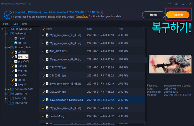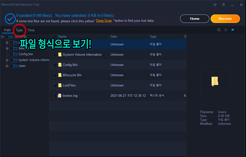 ํ์ผ์ ๋ณต๊ตฌํ ๋๋ ์ฃผ๋ก ํด์งํต์ ๋ฃ์๋ค๊ฐ ์ง์ฐ๋ ๊ฒฝ์ฐ๊ฐ ๋ง์์ ๊ฒฝ๋ก๋ก ์ฐพ์ผ๋ฉด ์ํ๋ ํ์ผ์ ์ฐพ๊ธฐ ์ด๋ ค์ธ ๋๊ฐ ๋ง๊ณ , ์ด๋ด ๋๋ 'Type' ํญ์ผ๋ก ์ด๋ํด์ ์ฌ์ง์ด๋ฉด jpg๋ png ํ์ฅ์ ํ์ผ, ๋ฌธ์๋ฉด ์๋ํ์ผ์ด๋ ํ์ํฌ์ธํธ๋ก ์ฐพ์๋ณด๋ฉด ์ํ๋ ํ์ผ์ ์ฐพ์ ์ ์์ต๋๋ค. ๊ฒฝ์ฐ์ ๋ฐ๋ผ์๋ 'Time' ํญ์ผ๋ก ๋ชจ๋๋ฅผ ๋ฐ๊ฟ์ ์ฐพ์๋ณด๋ ๊ฒ๋ ๋์์ง ์๊ฒ ๋ค์.