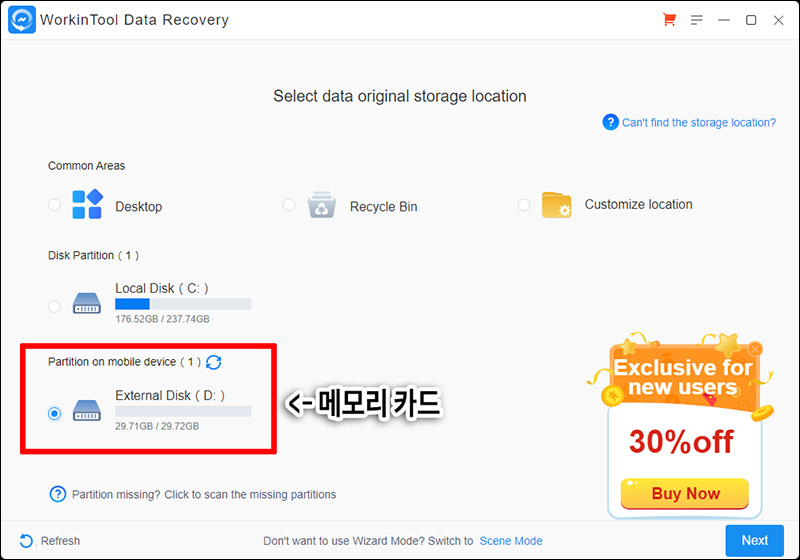 ์์ ๊ฐ์ด ๋ณต๊ตฌ๋ฅผ ํ๊ธฐ ์ํด ๋์ ๋์คํฌ๋ฅผ ์ ํํ ์ ์์ต๋๋ค. ์ญ์ ๋ ํ์ผ์ด ๋ค์ด์๋ ๋์คํฌ๋ฅผ ์ ํํ์๋ฉด ๋ฉ๋๋ค. ์ ๊ฒฝ์ฐ์๋ ์ฃผ๋ก ์ฌ์ง์ ์ดฌ์ํ๋ ๋ฉ๋ชจ๋ฆฌ์นด๋์ ๋ค์ด์๋ ์ด๋ฏธ์ง ํ์ผ๋ค์ ๋ณต๊ตฌํ๊ณค ํด์, D:๋ก ์กํ ์๋ ๋ฉ๋ชจ๋ฆฌ์นด๋๋ฅผ ์ ํํด๋ณด์์ต๋๋ค.