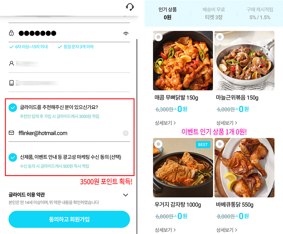 일단 위에 링크로 가입을 하시면 글라이드에 회원을 가입하실 때 추천회원 이메일 아이디가 입력이 되어 있고, 추천인을 입력하실 경우 3000원 포인트를 바로 사용하실 수 있습니다.