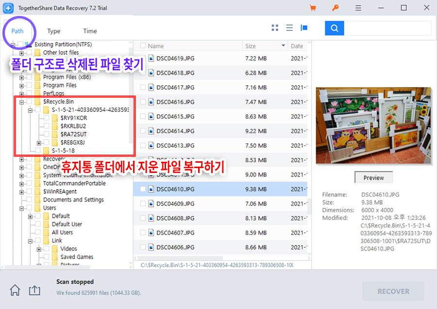 ๋ณต๊ตฌํ๊ณ ์ถ์ ํ์ผ์ ์ฐพ์๋ค๋ฉด, ๊ทธ๋ฆฌ๊ณ ๋ณต์์ด ๊ฐ๋ฅํ ์ด๋ฏธ์งํ์ผ์ด๋ผ๋ฉด ๋ณดํต 'Preview' ๋ฒํผ์ ๋๋ฌ์ ๋ฏธ๋ฆฌ๋ณด๊ธฐ๋ฅผ ํ ์ ์์ต๋๋ค. ๊ทธ๋ฆฌ๊ณ 'Recover' ๋ฒํผ์ ๋๋ฅด๋ฉด ๋ณต์์ด ๊ฐ๋ฅํ๊ตฌ์.