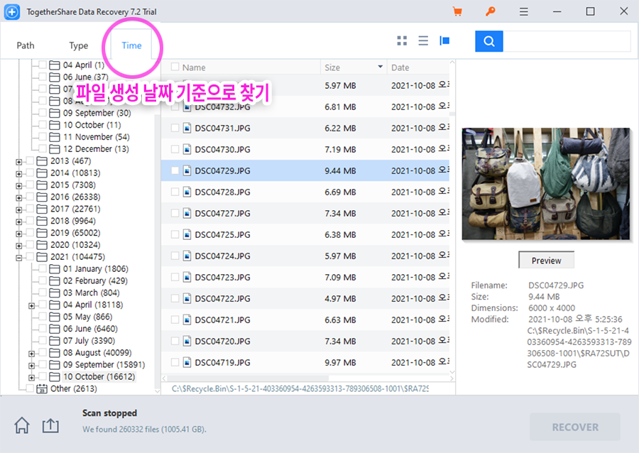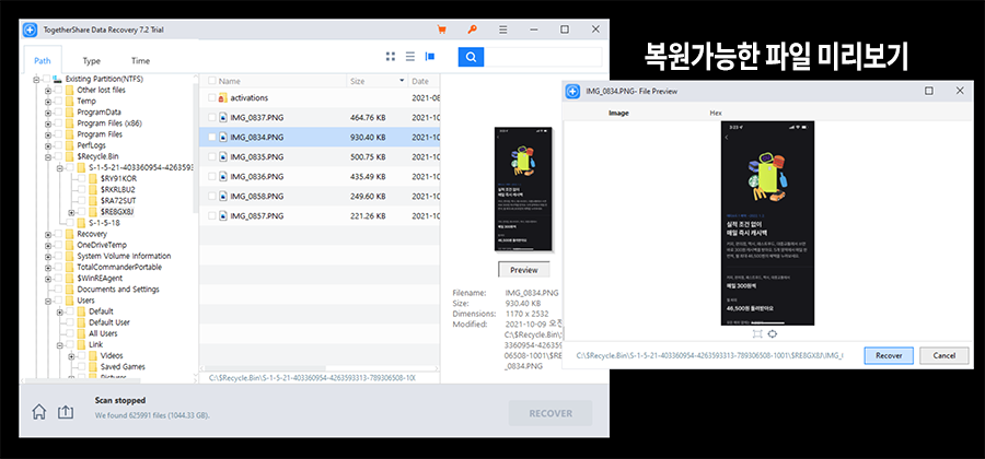 ๋ณต๊ตฌํ๊ณ ์ถ์ ํ์ผ์ ์ฐพ์๋ค๋ฉด, ๊ทธ๋ฆฌ๊ณ ๋ณต์์ด ๊ฐ๋ฅํ ์ด๋ฏธ์งํ์ผ์ด๋ผ๋ฉด ๋ณดํต 'Preview' ๋ฒํผ์ ๋๋ฌ์ ๋ฏธ๋ฆฌ๋ณด๊ธฐ๋ฅผ ํ ์ ์์ต๋๋ค. ๊ทธ๋ฆฌ๊ณ 'Recover' ๋ฒํผ์ ๋๋ฅด๋ฉด ๋ณต์์ด ๊ฐ๋ฅํ๊ตฌ์.