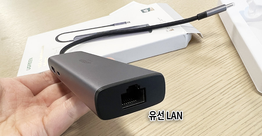 마지막으로 이걸 빼놓으면 안되죠. 7 in 1 허브이기 때문에 유선 랜 케이블을 연결할 수 있는 RJ45 포트가 있습니다. 요즘같이 무선 인터넷 와이파이를 쓰는 시대에 이게 왜 필요해(?)할 수 있겠지만... 은근 회사에서는 꼭 필요할 때가 많습니다. 보안이나 장비 환경 때문에 유선 인터넷을 연결해야 할 일도 많으니까요.