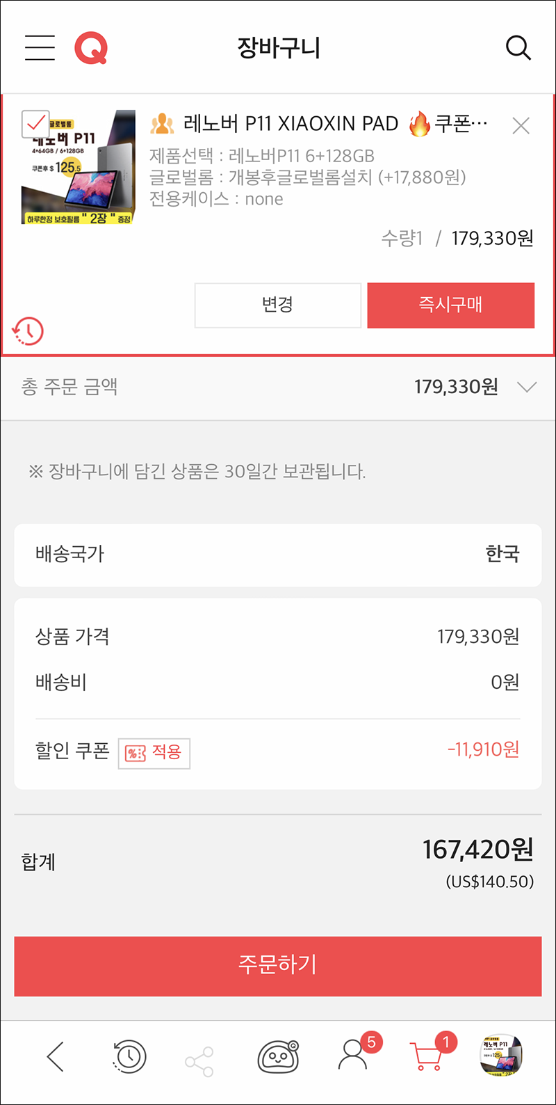 그런데 이 쿠폰은 모바일 앱에서만 받을 수 있네요. Qoo10 모바일 앱을 다운로드 받고 로그인한 뒤 다시 상품페이지에서 10$ 쿠폰을 다운로드 받습니다. 그리고 장바구니에 가서 미리 담아둔 레노버 P11를 쿠폰 적용해서 결제를 하면 되죠. (제가 살때보다 쿠폰할인이 늘어나서 지금은 16$ 쿠폰을 받으면 되겠네요.)