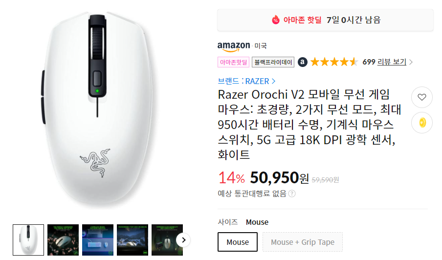 매우 가벼운 게이밍 마우스를 원한다면 선택해볼만한 오로치V2 마우스입니다. 얼마전에 제 블로그를 통해 리뷰를 해드린적도 있는데요. 화이트모델이 50%에 가깝게 할인중이네요.