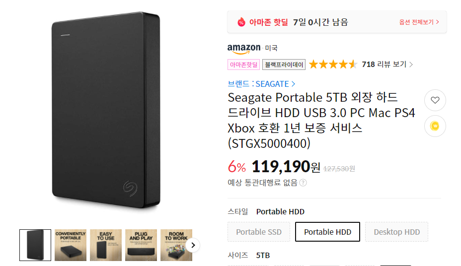 그 다음은 역시 외장하드죠. 내년이 되면 외장하드 가격이 크게 오를것이라는 전망이 있기 때문에 블프때 구입하는 것이 좋습니다. 요즘에는 왠지 WD보다는 시게이트에 더 정감이 가는데, 5TB 모델인데도 매우 저렴한 가격입니다.