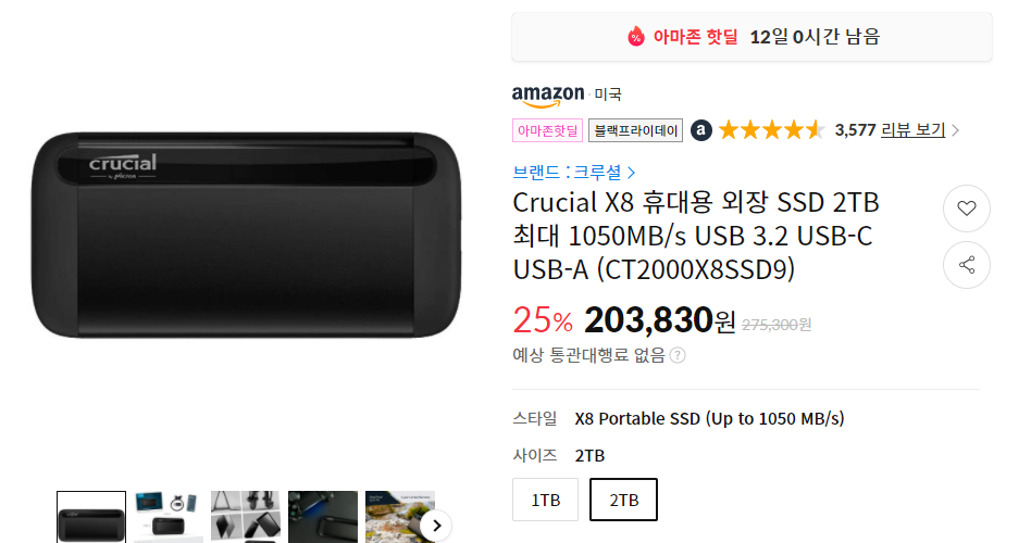 외장하드 말고 속도가 빠른 SSD 매니아라면 이제 1TB~2TB 고용량 모델도 정말 싸게 나옵니다. 크루시얼 SSD는 안정적이기로 정평이 나 있는데, 2TB 모델인데 이 가격은 정말 참기 힘든 가격인데요. 아래 1TB 모델도 있습니다.