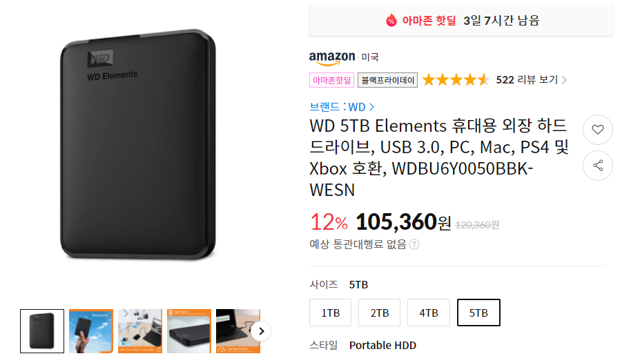 그 다음은 역시 외장하드죠. 내년이 되면 외장하드 가격이 크게 오를것이라는 전망이 있기 때문에 블프때 구입하는 것이 좋습니다. 요즘에는 왠지 WD보다는 시게이트에 더 정감이 가는데, 5TB 모델인데도 매우 저렴한 가격입니다.