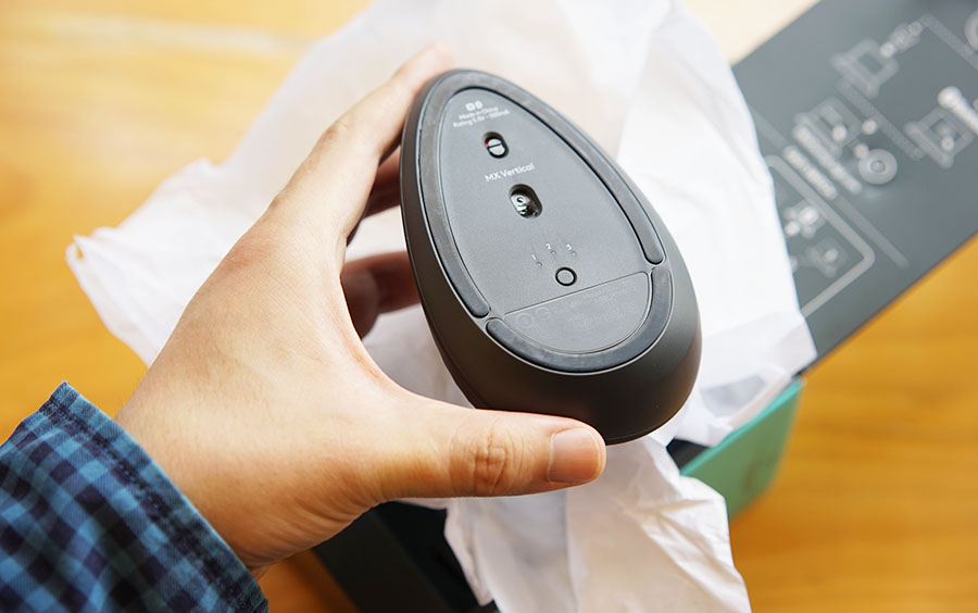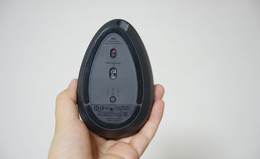 이렇게 삼각형을 연상시키는 로지텍 MX 버티컬 마우스가 있죠. 3개까지 무선 연결이 가능하고, 하단에 있는 버튼으로 페어링이나 전환이 가능합니다. 짧게 누르면 전환, 길게 누르면 페어링 모드죠.