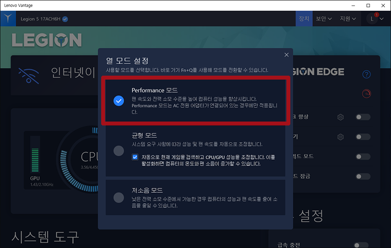 저는 아래 벤치마크 테스트를 하기 위해 Performance 모드로 조절을 했는데요. Vantage 앱에서 '열모드 설정'을 임의로 변경해주면 됩니다. 또는 아래에서 소개해드릴 Fn+Q 단축키를 통해 빠르고 쉽게 게이밍을 위한 고성능 모드로 전환이 가능하죠.