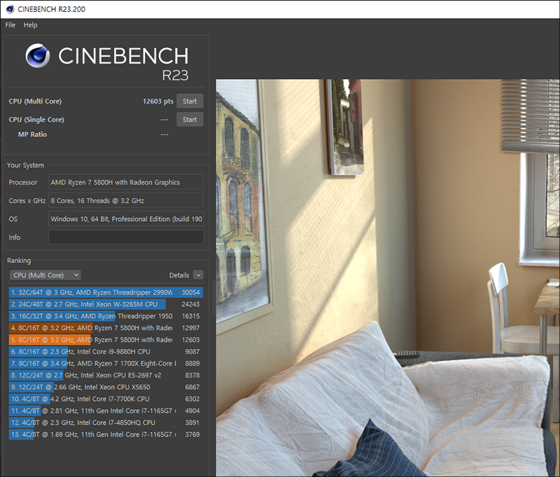 성능지표를 가장 잘 나타내준다는 씨네벤치R23의 점수는 12603점 입니다. Cinebench에서 이렇게 높은 점수가 나온건 처음인 것 같네요 :)