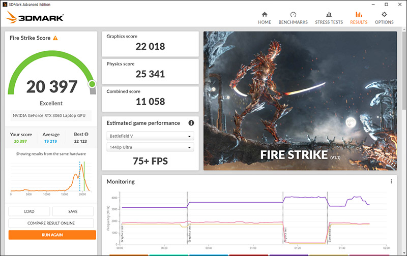 파이어스트라이트(FireStrike)는 20397점 입니다. 예전에는 고성능 데탑에서도 내기 어려운 높은 점수인데, AMD 세잔과 RTX30 시리즈가 나오면서 이제 게이밍 노트북의 전성시대가 열린듯 합니다. 노트북에서 너무 게임이 잘 되서 이젠 데스크탑이 오히려 인기가 없어지고 있어요 ^^