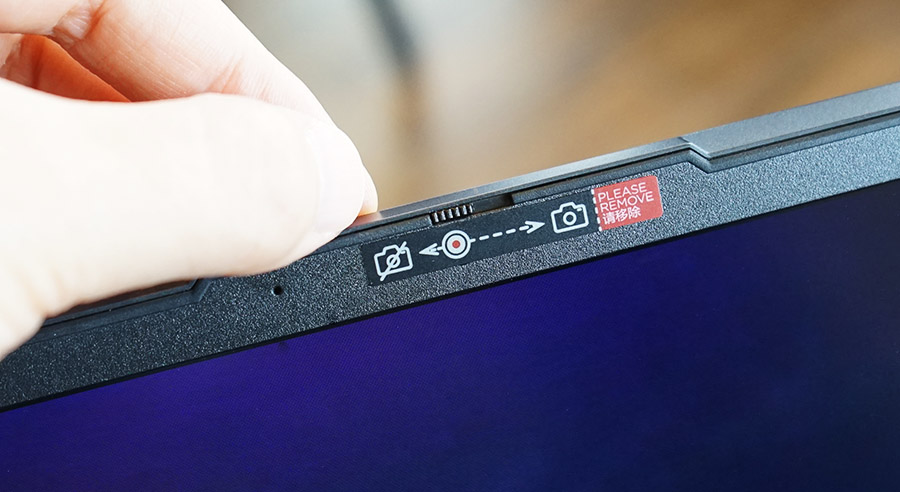 아직 이 제품으로는 화상회의를 할 일이 없었기에 스티커를 떼어내진 않았지만, 잘 보시면 물리커버가 있다는 것을 알 수 있습니다. 일종의 보안 기능으로 원천적으로 카메라를 가릴 수 있죠. ^^ 고급 기종에도 자주 빠지는 기능인데, 게이밍 노트북에 이렇게 세밀한 기능을 꼼꼼히 챙겼다는 것은 꽤 마음에 드네요.