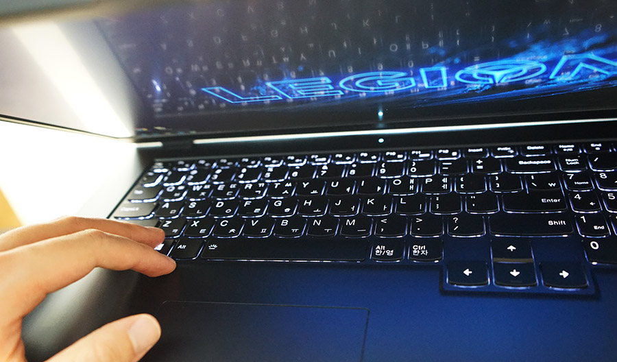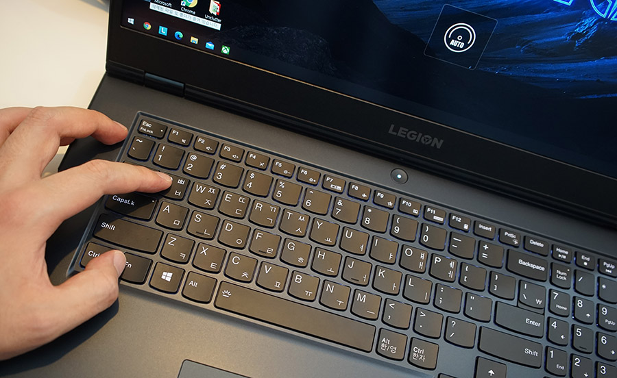 키보드는 레노버 게이밍 노트북 특유의 느낌을 가지고 있는데 반응이 좋고 타이핑 정확성이 두드러지는 느낌입니다. 반발력이 강하다기 보다는 소프트한 느낌이고, 키 깊이가 그다지 짧지 않고 1.5mm 정도로 적당하기에 적응하면 꽤 기분좋은 타건감을 즐길 수 있죠.