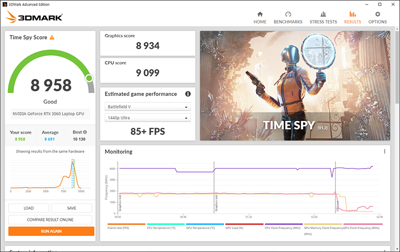 게이밍 노트북 리뷰에 빠질 수 없는 3D마크 벤치마크 테스트 입니다. 타임스파이(TimeSpy)는 8958점이 나왔구요.