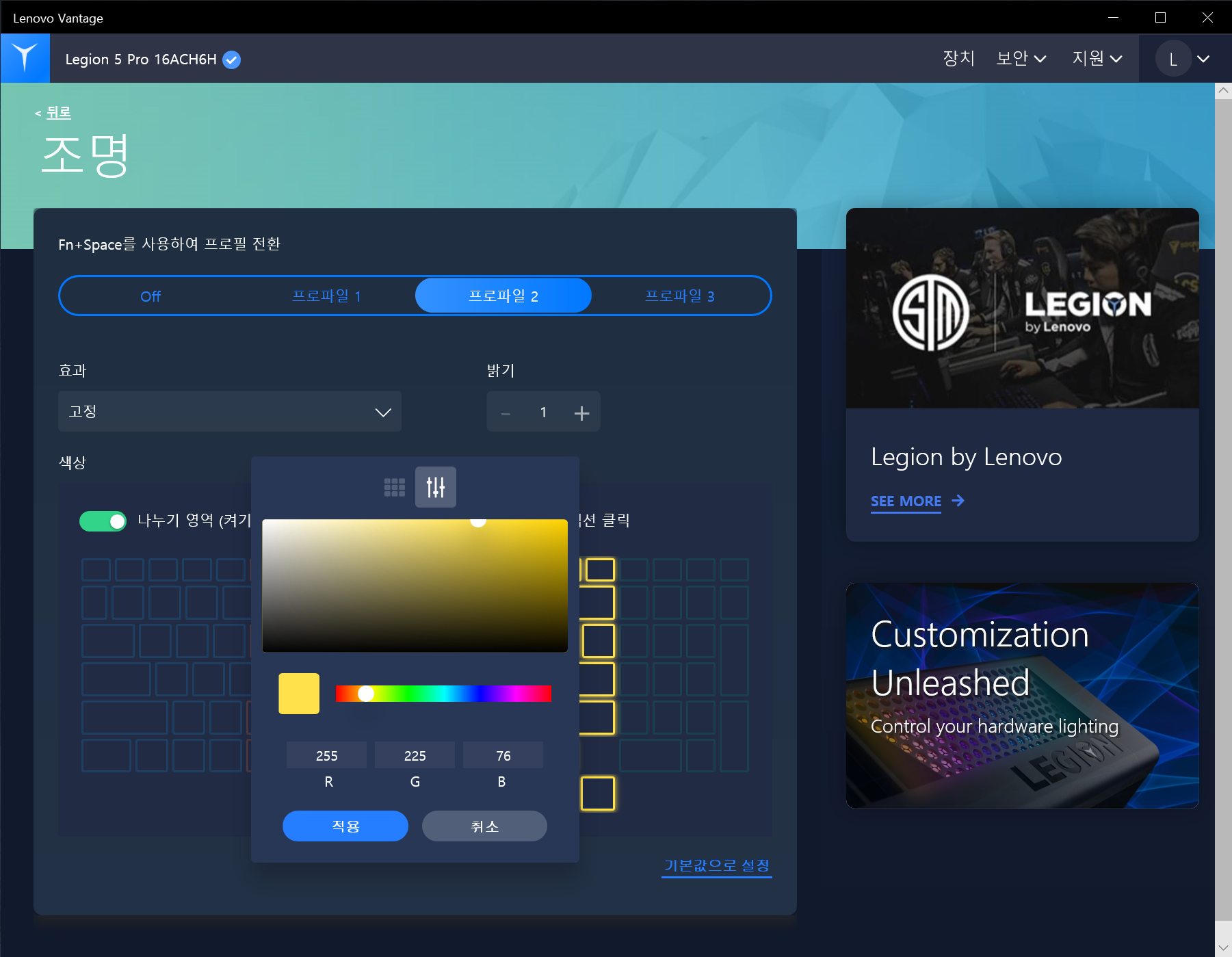 위와 같이 3개의 프로파일이 있고 컬러 커스터마이징이 가능하게 되었습니다. 원하는 RGB 컬러를 설정할 수 있어서 좋네요. 참고로 Fn+Space 바를 눌러서 키보드 백라이트를 ON/OFF 하거나 프로파일 전환이 가능합니다.