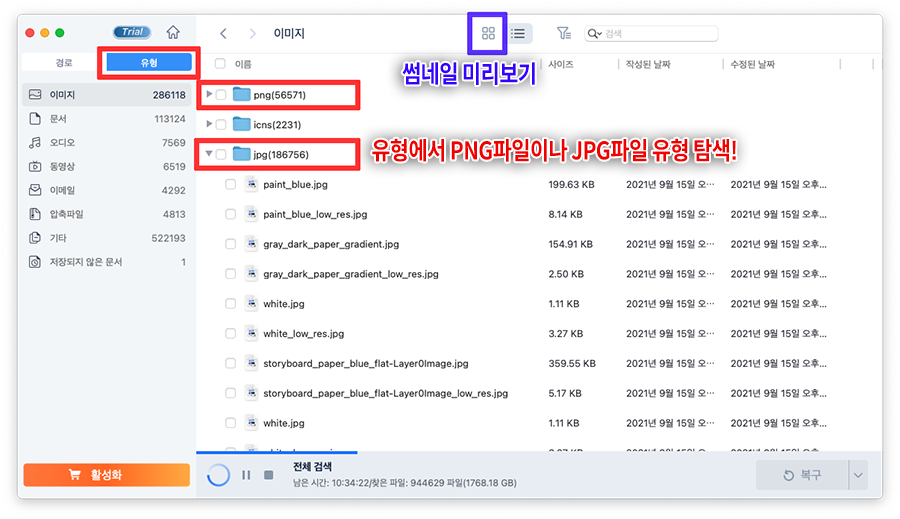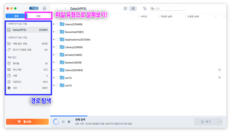 ๊ฒฝ๋ก๋ก ํ์์ ํ ์๋ ์์ง๋ง, ์ฃผ๋ก ํ์ผ์ ๋ณต๊ตฌํ๊ธฐ ์ํด ์ค์บ์ ํ๋ฉด '์ ํ'์ ํตํด ๋ณด๋ ๊ฒ์ ์ถ์ฒ๋๋ฆฝ๋๋ค. ์๋ฅผ ๋ค์ด ์ฌ์ง์ด๋ ์ด๋ฏธ์ง ํ์ผ์ด๋ฉด .jpg๋ .png๋ก ๋๋๋ ํ์ผ์ ํ์ํด๋ณด๋ฉด ๋ณต๊ตฌํ๋ ค๋ ํ์ผ์ ์ฐพ๊ธฐ ์ํด ๋ ์ฌ์ด ํ์์ด ๊ฐ๋ฅํฉ๋๋ค.