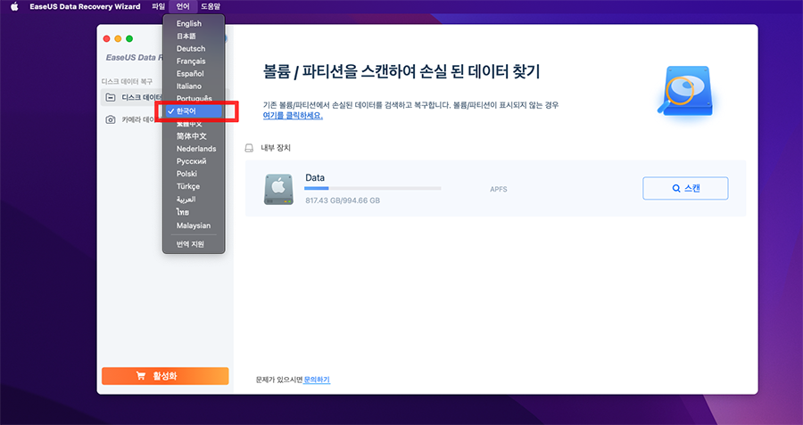 ์์ ๊ฐ์ ํ๋ฉด์ด ๋ด๋ค๋ฉด ์ด์ ๋งฅ์์ ํ์ผ์ ๋ณต๊ตฌํ ์ ์๋ ์ค๋น๊ฐ ๋๋ ๊ฒ์ธ๋ฐ์. ๊ณ ๋ง๊ฒ๋ EaseUS Data Recovery๋ ํ๊ตญ์ด(ํ๊ธ)๋ ์ง์์ ํฉ๋๋ค. ์์ '์ธ์ด' ๋ฉ๋ด์์ 'ํ๊ตญ์ด'๋ฅผ ์ ํํ๋ฉด!