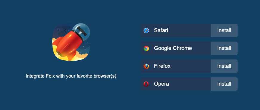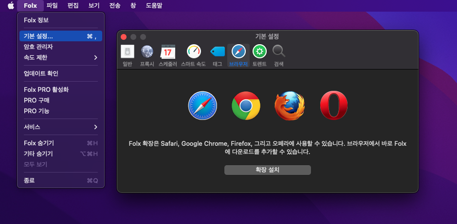 Folx ์ฑ์์ Command + ,(์ผํ) ๋จ์ถํค๋ฅผ ํตํด ์ค์ ์ผ๋ก ๋ค์ด๊ฐ๊ฑฐ๋, ์๋จ ๋ฉ๋ด์์ ๊ธฐ๋ณธ์ค์ -> ๋ธ๋ผ์ฐ์ ์์ ์์ ์ด ์ฌ์ฉํ๊ณ ์๋ ๋ธ๋ผ์ฐ์ ์ ํ์ฅํ๋ก๊ทธ๋จ์ ์ค์นํด์ฃผ๋ฉด ๋์ฃ . ^^