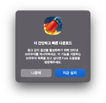 ๋ง์ฝ ์์ ๊ฐ์ด ํ๋๋ฐ๋ ์ฌ์ฉํ๋ ๋ธ๋ผ์ฐ์ ์์ ๋ค์ด๋ก๋๊ฐ Folx ํด๋ผ์ด์ธํธ๋ก ๋ฐ์์ง์ง ์๋๋ค๋ฉด, ์๋์ผ๋ก Add-on ํ์ฅ ํ๋ฌ๊ทธ์ธ์ ์ค์นํด์ฃผ์๋ฉด ๋ฉ๋๋ค.