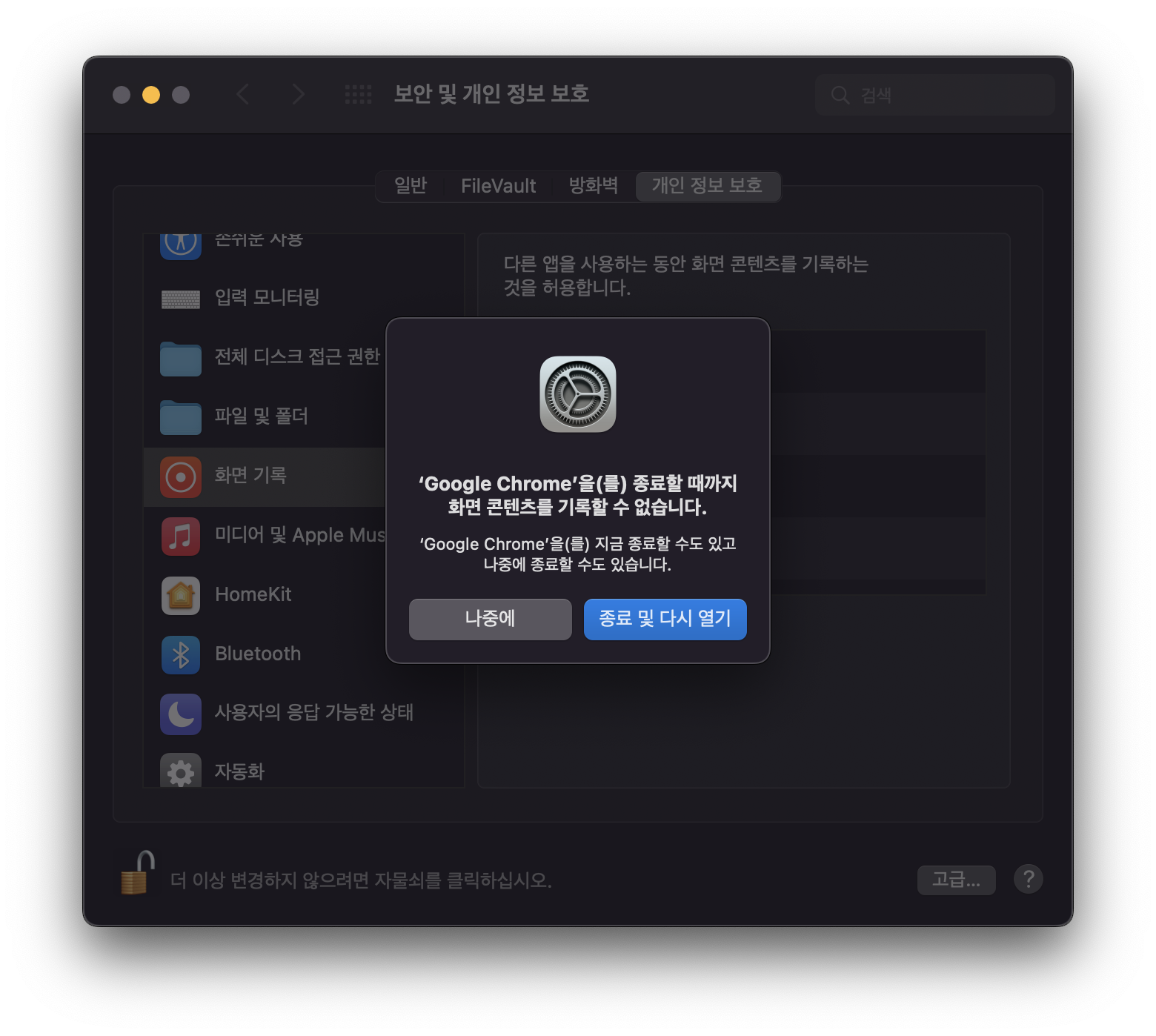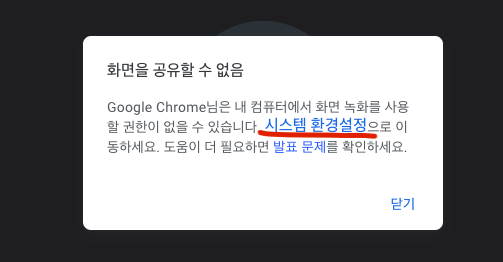 ์๋ฌ๋ฉ์์ง๊ฐ ๋ ํนํ๋ฐ์. 'Google Chrome๋ ์ ๋ด ์ปดํจํฐ์์ ํ๋ฉด ๋ นํ๋ฅผ ์ฌ์ฉํ ๊ถํ์ด ์์ ์ ์์ต๋๋ค.' ๋ผ๊ณ ๋น๋๋ค. ๋ธ๋ผ์ฐ์ ๋ ์กด์นญ์ ํด์ฃผ๋ ๊ตฌ๊ธ์ ๋ฉ์ง ํ๋ฒ์ด์ฃ ^^