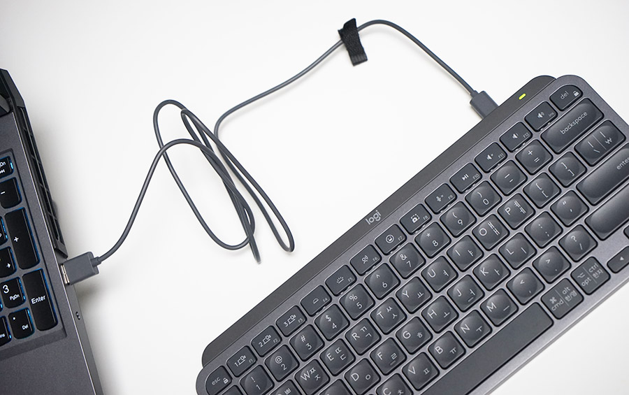 이렇게 USB A to C 케이블로 충전을 하곤 하죠. MX Keys Mini의 경우 for Mac 제품은 키보드 레이아웃도 살짝 다르니 참고하시기 바랍니다.
